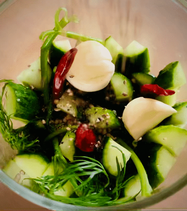 마늘 4쪽, 머스터드 씨드 2 티스푼, 통후추 2 티스푼, 딜 7~8g, 페페론치노 7~8개,